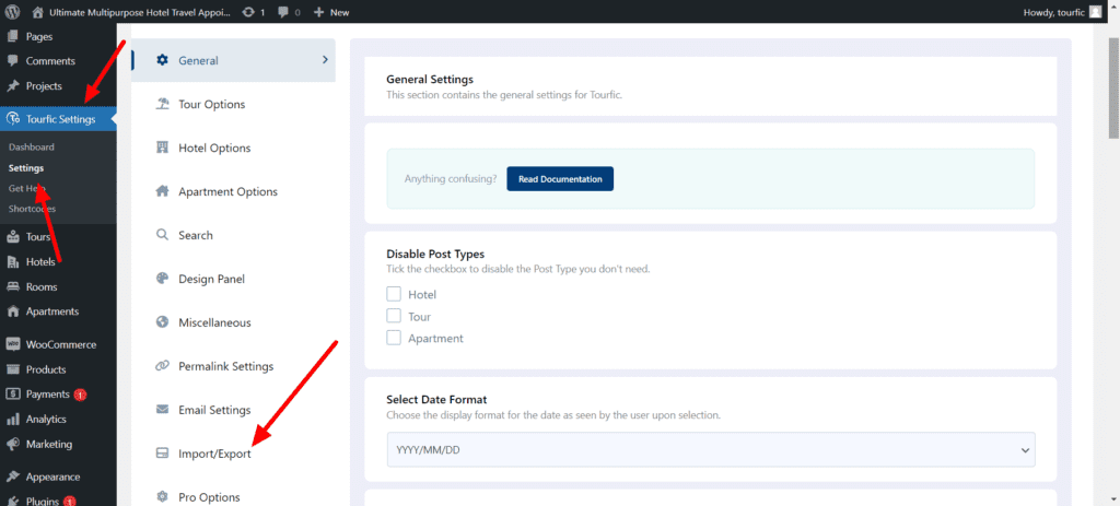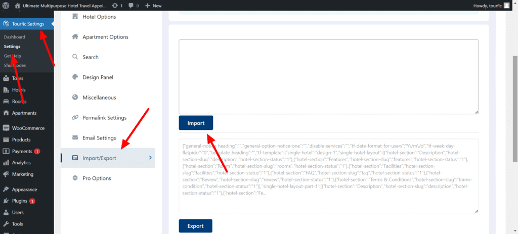 Step 1 ; WordPress Dashboard > Tourfic Settings > Settings > Choose Import/Export from the Sidebar Menu